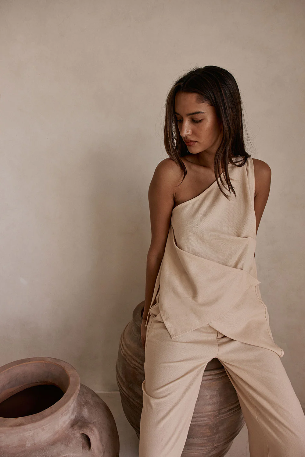 Minimal and chic, the Eden Top is made from a natural linen cotton blend fabric in a beige hue. It features an asymmetric neckline, layered draping detailing across top and an asymmetric hem. Pair with the Eden Pants. Designed exclusively by Sabo.
