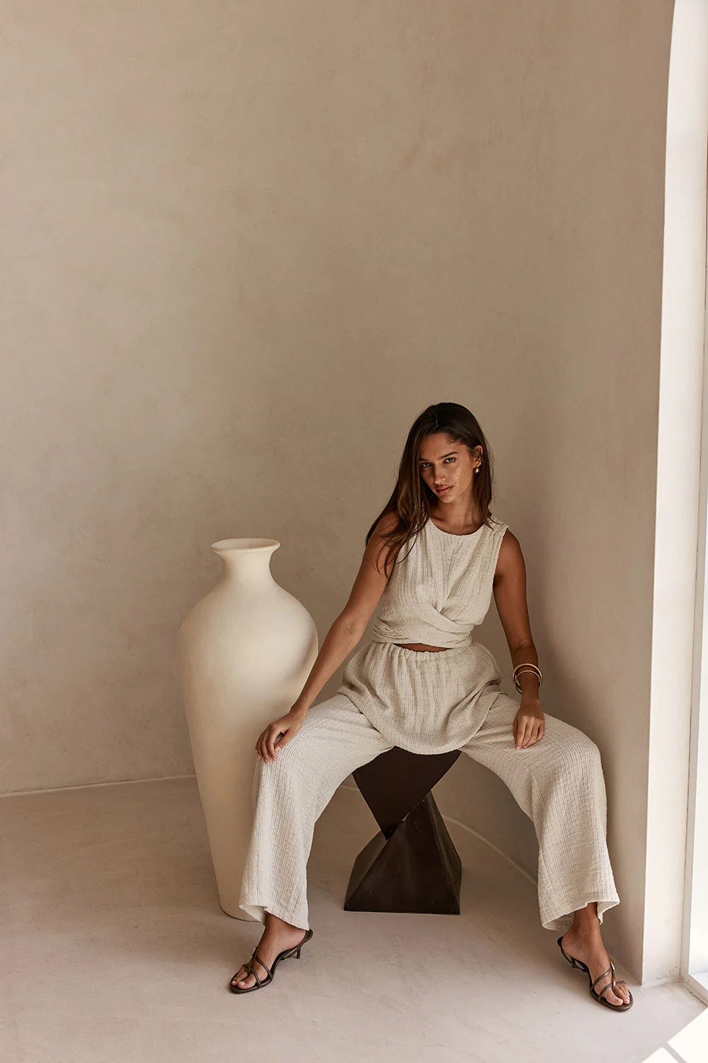A chic design in a stunning textured beige fabric, the Maia Jumpsuit features gathers at shoulders, wrap ties and cutout details at waist, gathered top overlay and relaxed pants. Styling tip: waist tie can also be tied at front waist! Designed exclusively by Sabo.